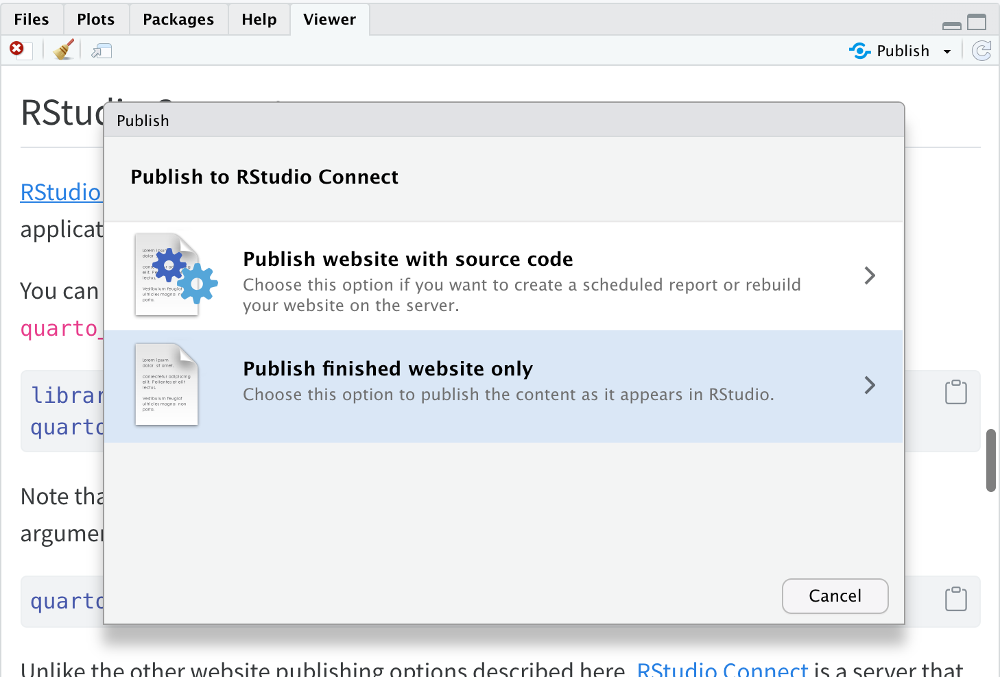 If you are using the RStudio IDE, there is also support for push-button publishing to Posit Connect. Use the publish button from the source editor or viewer pane to publish a document or a website: